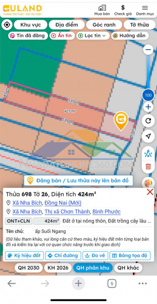 *CẦN BÁN GẤP ĐẤT GIÁ TỐT – XÃ NHA BÍCH, CHƠN THÀNH , TỈNH BÌNH PHƯỚC*LỢI THẾ VÀNG – SÁT KHU CÔNG NGHIỆP BECAMEX MINH THÀNH * Vị trí: Ấp Suối Ngang, Xã Nha Bích, Đồng Nai. Cách Becamex Minh Thành 1km. *Diện tích: ~424m² (ngang 8m x dài 53m) *Thổ cư 100m2 ** Ưu điểm nổi bật: * Mặt tiền ngang 8m – dễ xây nhà, làm kho xưởng hoặc đầu tư * Thửa đất dài, vuông vức – tối ưu công năng sử dụng * Khu dân cư hiện hữu, xung quanh đã có nhà ở. * Đường tiếp cận rõ ràng, thuận tiện di chuyển * Tiềm năng tăng giá: – Nằm trong khu vực đang phát triển mạnh của Chơn Thành - Không chỉ là KCN, Becamex còn phát triển thành khu liên hợp công nghiệp + đô thị + dịch vụ hiện đại. – Gần khu công nghiệp, nhu cầu ở thực cao. – Đầu tư trung hạn rất tốt.Vui lòng liên hệ: 0931339799