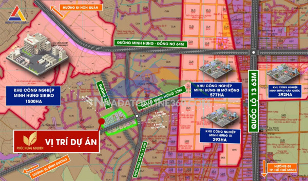 ???? Vị trí đắc địa: Dự án nằm ngay mặt tiền Đại lộ Minh Hưng - Dầu Tiếng (đường N11 có lộ giới 51m), thuộc vùng lõi Khu công nghiệp Minh Hưng III, thị xã Chơn Thành, tỉnh Bình Phước. Bao quanh là cụm 4 KCN siêu khủng đang hoạt động mạnh mẽ: Minh Hưng 3, Minh Hưng Hàn Quốc, Sikico Nhật Bản và Becamex Chơn Thành.