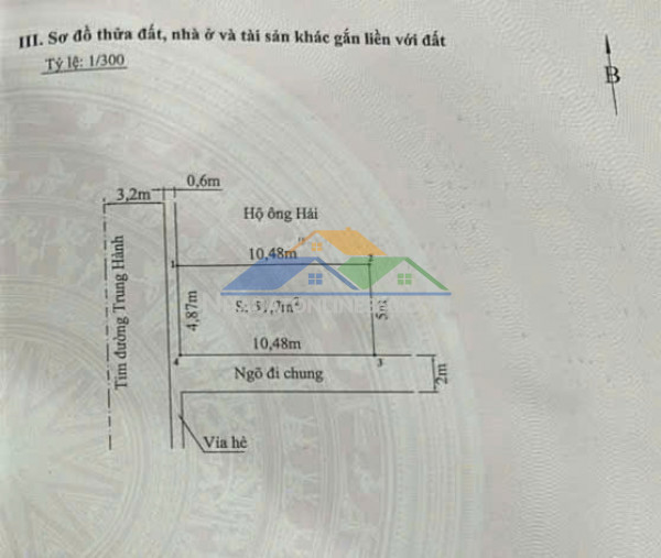 • Diện tích ~ 52m• Mặt tiền 4.8m dài 10m• Hướng Tây• Đường nhựa + vỉa hè 2 bên