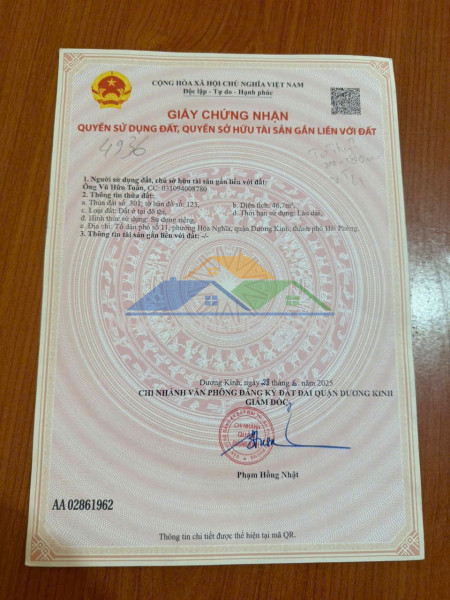 Bán đất Ngõ 78 Tư Thủy, Hòa Nghĩa, Dương Kinh đường rộng 8m - ZALO 0567 222 555-Diện tích: 46,7m2-Mặt tiền: 5m-Đường/ngõ: Đường thực tế rộng khoảng 8m, ngõ thông, ô tô tránh nhau thoải mái.-Vị trí: Tổ dân phố số 11 (Ngõ 78 Tư Thủy), phường Hòa Nghĩa, quận Dương Kinh, Hải Phòng. Cách đường Phạm Văn Đồng (353) khoảng 500m, cách đường trục chính 402 khoảng 200m.-Pháp lý: Sổ hồng chính chủ (Thửa 301, tờ bản đồ 123).-Giá: 1,xx tỷ-Tiềm năng/đầu tư: Vị trí đẹp, hạ tầng đồng bộ, dân cư văn minh, phù hợp định cư lâu dài hoặc đầu tư sinh lời tốt trong phân khúc tài chính nhỏ.-Liên hệ ngay để xem đất và sở hữu lô đất đẹp không lỗi phong thủy.-NHÀ ĐẤT ANH MINH 782 Phạm Văn Đồng, Dương Kinh, Hải Phòng-Trọng Điểm: Dương Kinh • Đồ Sơn • Kiến Thụy-SĐT/ZALO: 0567 222 555-Thông tin mang tính tham khảo tại thời điểm đăng. Xin vui lòng kiểm tra thực tế.-#batdongsanduongkinh #hoanghia #datnenhaiphong #bandatduongkinh #dautubds