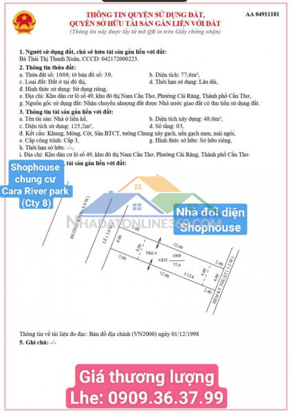* Địa chỉ: Nhà số J12A, đường số 19, KDC Đô Thị Hưng Phú mới, Phường Hưng Phú, Quận Cái Răng, TP. Cần Thơ (sát bên trái nhà có trụ anten trên sân thượng)* Diện tích đất: 77,6 m²- Diện tích xây dựng: 125,2 m²- Kết cấu: 1 trệt, 1 lầu, 1 lửng, gồm 4 phòng ngủ,3 nhà vệ sinh- Nhà xây dựng kiên cố, Rộng rãi, Thoáng mát,sạch sẽ.* Tiện ích:- Nhà Có vị trí đẹp, Ngay mặt tiền đường, Lộ giới 8m.- Đối diện shophouse chung cư Cara River Park- Bên trái view công viên- Khu vực đắc địa, phù hợp kinh doanh hoặc cho thuê- Khu dân cư sầm uất, dân trí cao giao thông thuận tiện- Đầu tư sinh lời cao- Sổ Hồng Chính Chủ, Pháp Lý rõ ràng.* Giá bán: 10 tỷ Có thương lượng cho khách mua thiện chí.- Hiện trạng: Đang có thu nhập từ cho thuê* Phù hợp kinh doanh nhiều ngành nghề* Có thể cho các nhãn hàng thuê