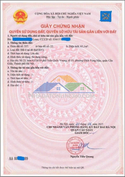 CHÍNH CHỦ BÁN ĐẤT, TẶNG NHÀ, 2 THOÁNG, NGÕ 63 TRẦN QUỐC VƯỢNG, DỊCH VỌNG HÂU, CẦU GIẤY, SÁT GẦN SUN FELIZA, DT: 63.1M2, 11.9 TỶ.
