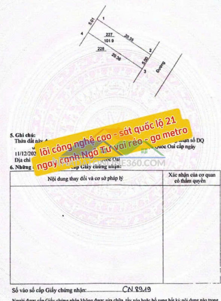 Diện tích: 102m2 toàn bộ là đất ở, sổ đỏ sẵn, công chứng trong ngày.