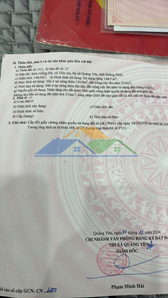 - Địa chỉ : Thôn Giếng Đá , Xã Tiền An , Thị Xã Quãng Yên , Tỉnh Quảng Ninh- Diện tích : 148,5m2- Vị trí: Đất nằm sau lưng bệnh viện Quảng Yên, thôn Chùa, là khu vực dân cư đông đúc, an ninh tốt, gần các tiện ích như bệnh viện, trường học, chợ và các dịch vụ công cộng khác.- Khu dân cư đông đúc , hàng xóm thân thiện - Giao thông thuận tiện đi lại - Đất nở hậu mặt tiền rộng đường ô tô tránh nhau thông tứ phía ( sau lưng bệnh viện quảng yên - thôn chùa )- Pháp lỹ rõ ràng