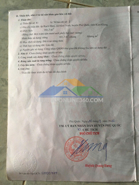Chính chủ cần bán lô đất tại ấp rạch hàm - hàm ninh - phú quốc - kiên giang