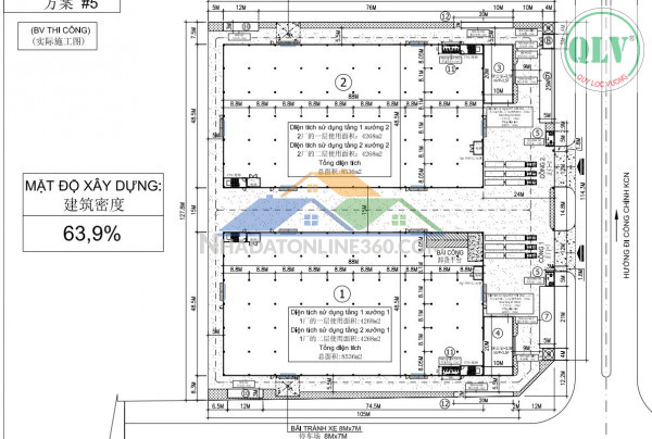 Nhà xưởng 1: DTXD 9.236m² (1 trệt 1 lầu: 4.268m² + 4.268m²), văn phòng 700m² (3.5 tầng), có 2 thang máy, bình điện 400 KVA, bãi xe công và các công trình phụ trợ khác