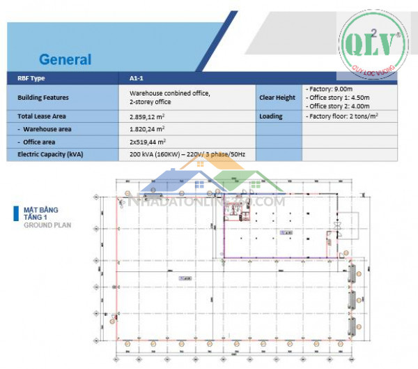 Văn phòng (1 trệt, 1 lầu): 519m² x 2 = 1.038m²