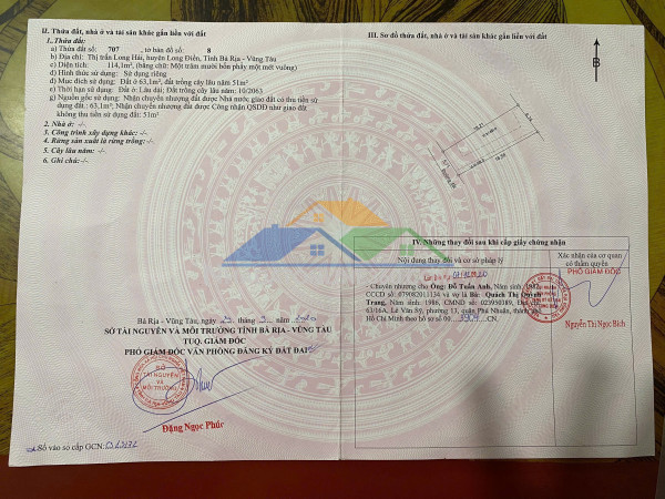 Chủ bán đất Xã Long Hải TPHCM . Cách biển 2km . Lưng tựa núi mặt hướng biển . Dân cư kín ???????? Diện tích : 5,7 x 18 . Nở hậu 6,8 .Tổng : 114 m2 . 63 thổ cư . Đường bê tông xe hơi . Đất sạch cao ráo .Giá bán : 1tỷ 750 triệu có bớt .