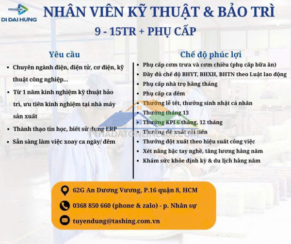 Liên hệ ứng tuyển:ĐT: 0368850660 – Ms. Giang HCNSEmail: tuyendung@tashing.com.vnĐịa chỉ làm việc: 62G An Dương Vương, Phường Bình Phú, TP. HCM(Địa chỉ trước sáp nhập: 62G An Dương Vương, Phường 16, Quận 8, TP.HCM)