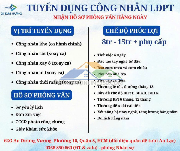 Công ty TNHH Di Đại Hưng chuyên sản xuất bao bì nhựa & nhựa gia dụng cần tuyển gấp nhiều vị trí*** Chế độ phúc lợi:- Thưởng hội nhập 600k đối với công nhân sản xuất- Phụ cấp cơm trưa và cơm chiều (phụ cấp bữa ăn)- Đầy đủ chế độ BHYT, BHXH, BHTN theo Luật lao động- Phụ cấp nhà trọ hằng tháng- Phụ cấp ca đêm (các vị trí xoay ca)- Thưởng lễ tết, thưởng sinh nhật cá nhân- Thưởng tháng 13- Thưởng KPI 6 tháng, 12 tháng- Thưởng đề xuất cải tiến- Thưởng đột xuất theo hiệu suất công việc- Xét nâng bậc tay nghề, tăng lương hằng năm- Khám sức khỏe định kỳ & du lịch hằng năm=====