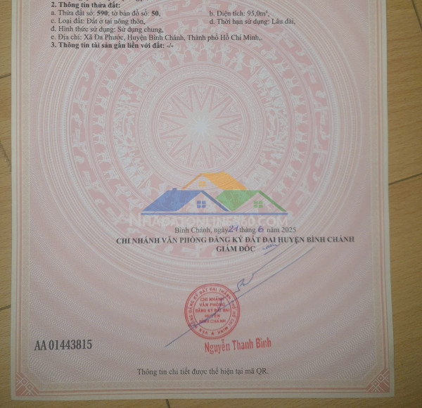 - Nay là : nay thuộc xã Hưng long** diện tích : 95m2 full thổ cư- giá bán : 2 tỷ 200 triệu ( có thương lượng mạnh )
