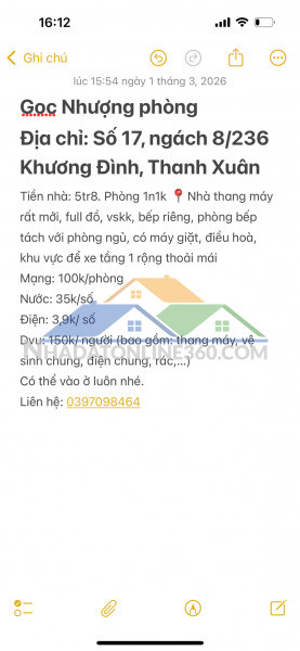 - Đầu tháng mình cần nhượng phòng tại 236 Khương Đình do chuyển chỗ làm, phòng như ảnh mọi người đến xem phòng trực tiếp ạ- Phòng đầy đủ tiện ích, điều hoà, giường, tủ bếp riêng, máy giặt, báo cháy....khoá vân tay an toàn, tiện lợi, thang máy…… chỉ việc xách vali đến ở ạ- Phòng 1n1k đầy đủ, tiện nghi. - Giá 5tr8. Phù hợp ở 3-4 người- Nhà đầy đủ trang bị pccc, giờ giấc tự do ko chung chủ .Để xe free tầng 1