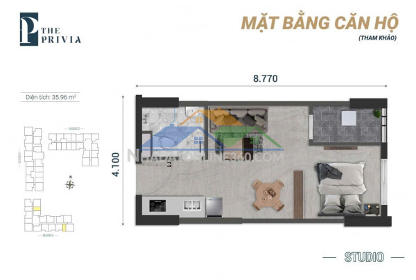 Kết cấu: Căn hộ gồm 1 phòng ngủ, 1 WC, phòng khách, khu bếp, ban công; thiết kế thông minh, không gian mở, tối ưu ánh sáng tự nhiên (cửa Tây, ban công Đông)