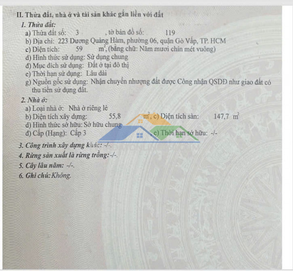 -> Chính chủ cần bán nhanh căn nhà tại vị trí đắc địa đường Dương Quảng Hàm, khu vực sầm uất, thuận tiện kinh doanh hoặc đầu tư lâu dài* Địa chỉ: 223 Dương Quảng Hàm, phường An Nhơn , TP HCM ( Phường 6, gò vấp )* Giá bán: 15,5 tỷ ( có thương lượng ) * Diện tích : 59m2