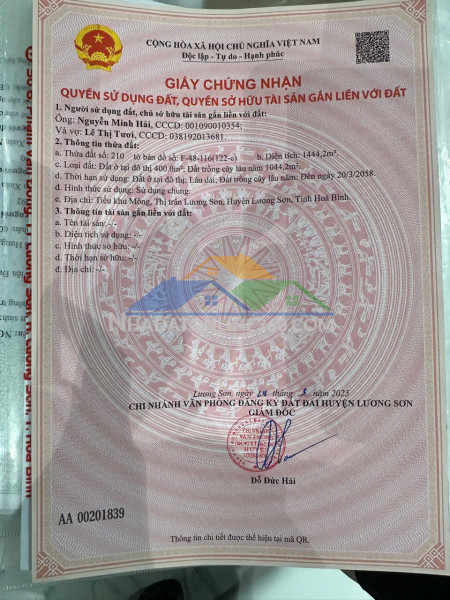 SỞ HỮU NGAY LÔ ĐẤT 2 MẶT TIỀN ĐẸP - GIÁ TỐT - Vị Trí Đắc Địa Tại Trung Tâm TT Lương Sơn, Huyện Lương Sơn, Hoà BìnhDiện tích: 1444,2m2 có 400m thổ cưGiá bán: 9tr/m2- Lô đất đẹp nằm ngay vị trí trung tâm nên gần trường, chợ, bệnh viện, ...- Nằm ngay trong khu dân cư đông đúc- Thích hợp đầu tư xây dựng hay kinh doanh buôn bán- Đường rộng, đi lại thuận tiện, mặt trước asphal 7,5m, mặt sau đường 3m- Pháp lý đầy đủ, thủ tục sang tên nhanh chóng- TIỀM NĂNG LỚN: Nhà đất luôn tăng giá theo tình hình chung của BĐS nên đảm bảo đầu tư sinh lời caoLiên hệ 0898987899